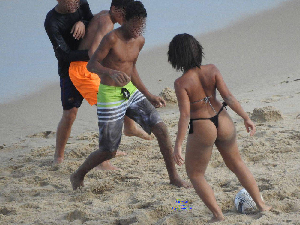 Gostosa jogando com amigos, sob sol forte e biquini socado na bunda.