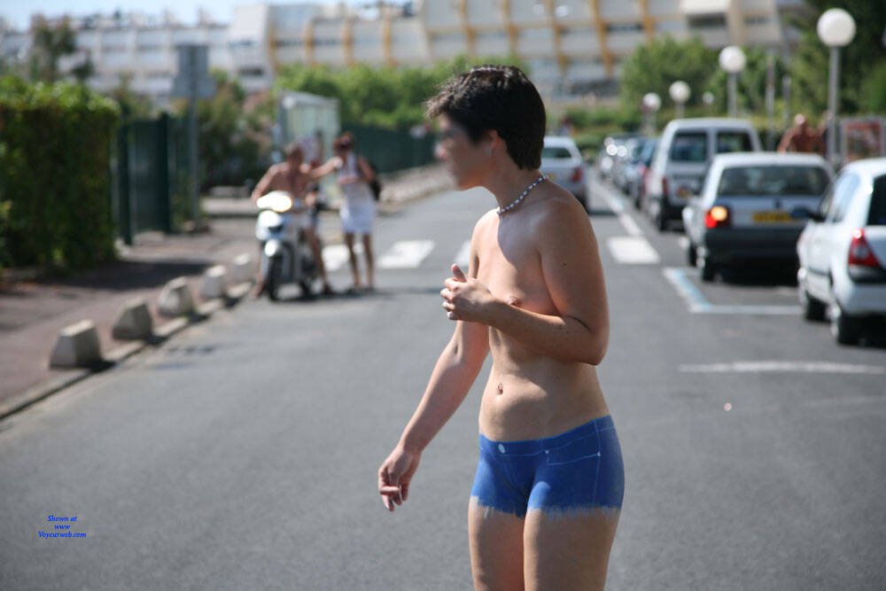 Mike loves painting me with blue jean cut off shorts and then I go out barefoot and naked in public, either in full daylight or for the evening and night. When I'm out at in the evening everyone can see I'm barefoot and topless but those who really see that I'm totally naked suddenly do a double take, then smile then lots of them come up and ask whether it is actually paint or just very tight shorts and want to touch to make sure. The last shot of me late at night with the shorts all smudged is after a long evening of strolling around naked in public with the evidence of just how many people wanted to check me out, touch me and feel the shorts. It is so sexy and fun to be out at night arm in arm with Mike walking along or in a crowded bar looking topless but actually being totally naked in public.