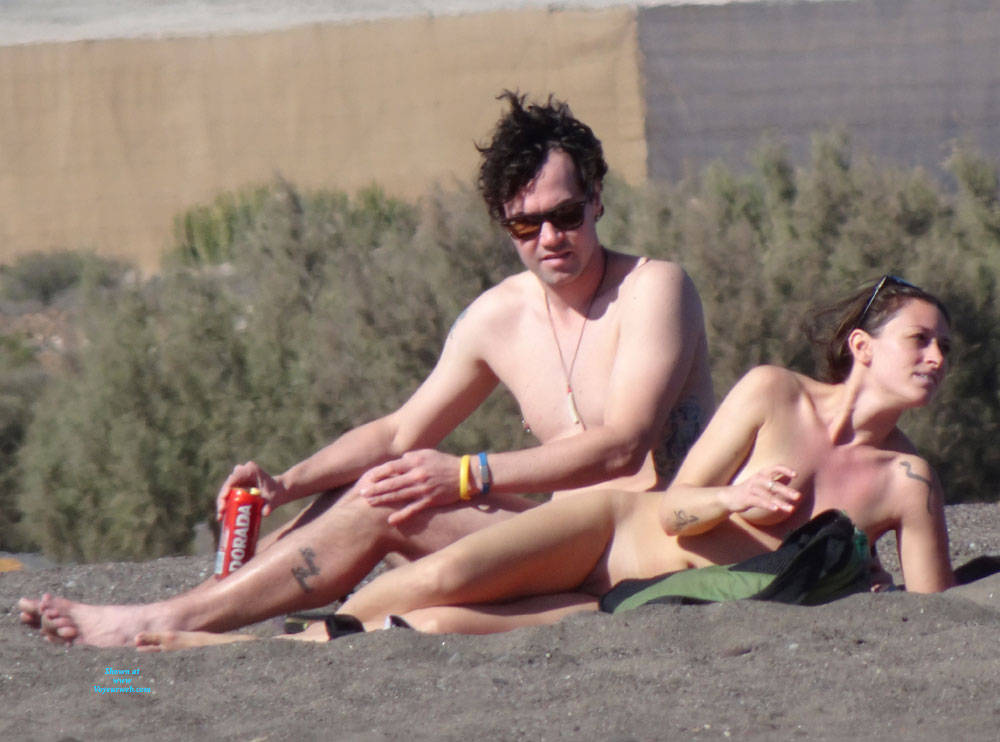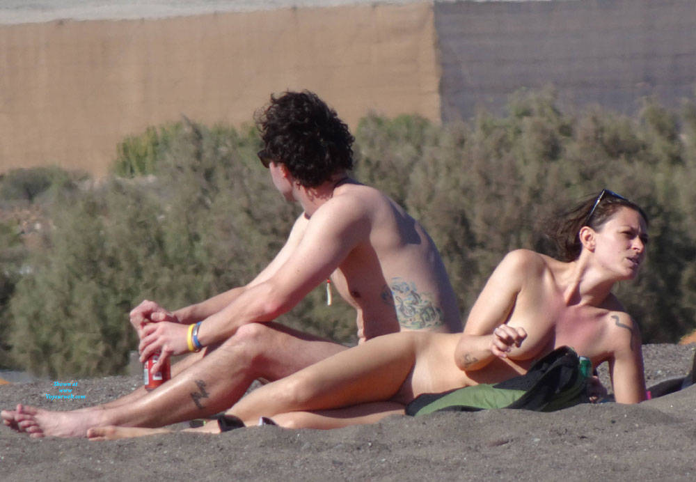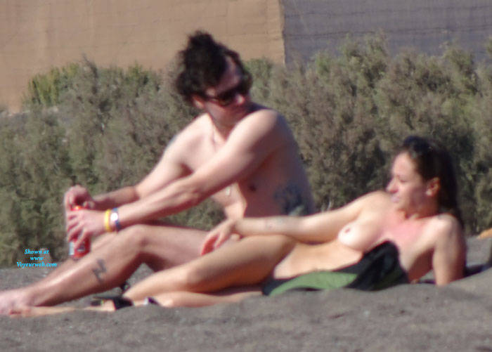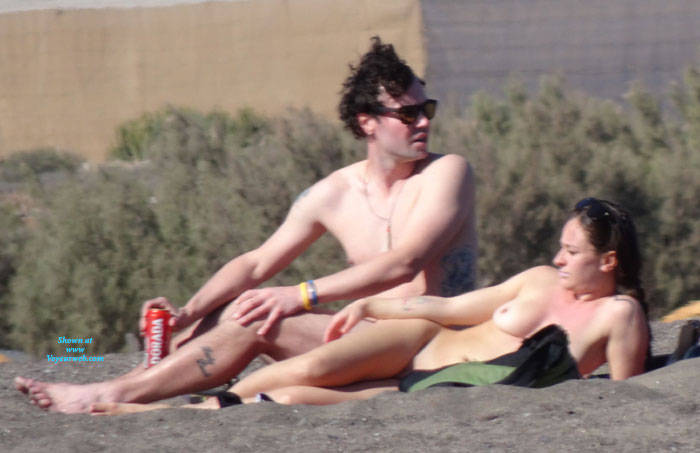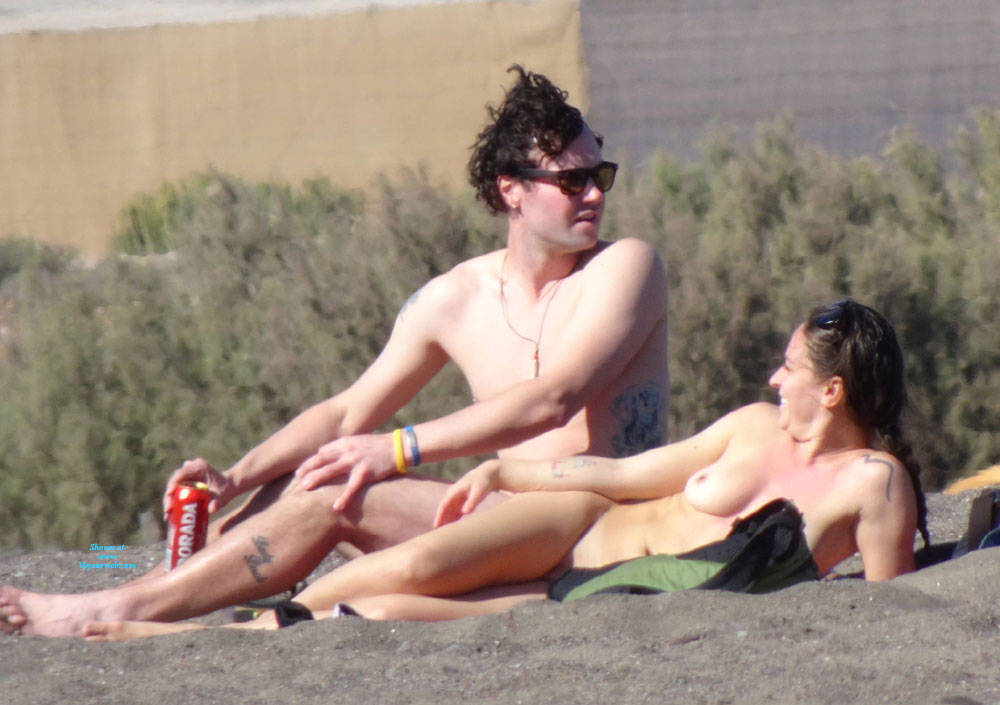 Enjoying the sun on the beach and watching the sea with her tits out.
